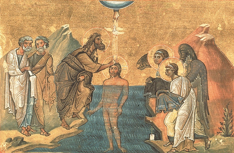 Пришел из Галилеи на Иордан к Иоанну Крестителю и Сам Иисус. Увидев Его, Иоанн Креститель попытался удержать Его: «Мне надобно креститься от Тебя, зачем же Ты пришел ко мне?» Но Иисус ответил ему: «Оставь теперь, не удерживай Меня, потому что так нужно нам исполнить всякую правду», то есть исполнить все, повеленное Богом, и показать пример людям. Тогда Иоанн повиновался и крестил Иисуса Христа. Зайдя в воду, Иисус тотчас вышел из реки — и тогда отверзлись небеса, и Он увидел Духа Божия, Который сходил, как голубь, и спускался на Него. И с небес прозвучал голос: «Это Сын Мой возлюбленный, в Котором Мое благоволение». Чудо это видел и Иоанн Креститель, который рассказывал потом: «Я видел Духа, сходящего с неба, как голубя, и пребывающего на Нем. И я видел и свидетельствую, что Он — Сын Божий».