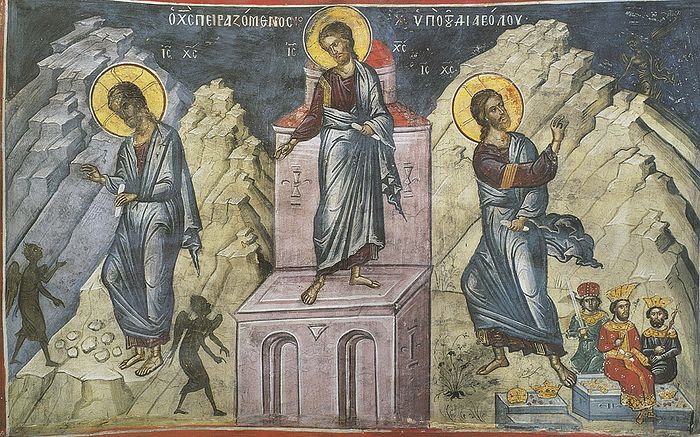 После крещения Иисус удаляется в иудейскую пустыню. В течение сорока дней Он постился и ничего не ел. В Ветхом Завете подобные продолжительные постнические подвиги несли пророки Моисей и Илия.