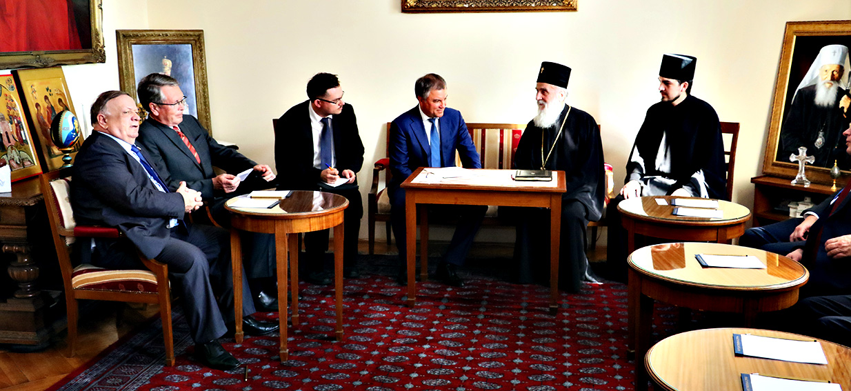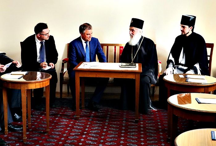 Његова Светост Патријарх српски г. Иринеј примио је 5. јуна 2017. године у Патријаршији српској у Београду Његову Екселенцију г. Вјачеслава Володина, председника Државне думе Федералне скупштине Руске Федерације.
