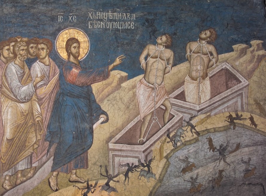 Одно из самых ярких чудес изгнания бесов Господь совершил в Десятиградии близ городов Гадара и Гергеса. Эта область лежала на другом берегу Галилейского озера. Иисус с учениками приплыл туда на лодке. В той области жили два свирепых бесноватых. Они поселились в пещерах для погребения и пугали всех, кто проходил тем путем. Приход Иисуса Христа оказался нестерпим для бесов, обитавших в этих несчастных людях. Бесы просили Господа, чтобы, когда Он изгонит их, разрешил им войти в стадо свиней, пасущееся вдали. Когда Иисус разрешил им это, нечистые духи, выйдя из людей, вошли в свиней; и все стадо, влекомое этой страшной и разрушительной силой, устремилось с крутизны в море. Те, кто пасли свиней, побежали в город и рассказали о случившемся. И тогда весь город вышел навстречу Иисусу, но не с тем, чтобы отблагодарить Спасителя за избавление от страшных бесов, а с тем, чтобы просить Его покинуть их страну. Один исцеленный от беснования просил Иисуса разрешить ему последовать за Ним, но Иисус отпустил его, сказав: «Возвратись в дом твой и расскажи, что сотворил тебе Бог». Тот остался и проповедовал повсюду, что сотворил ему Иисус (см.: Мф 8, 28-34; Мк 5, 1–20; Лк 8, 26-39).