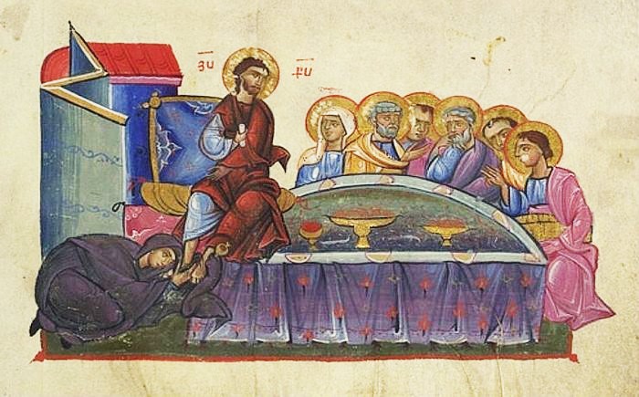 Приближалась Пасха, и люди с нетерпением ждали, что Иисус Христос придет на праздник в Иерусалим. И действительно, за шесть дней до Пасхи Иисус вновь пришел в Вифанию. Здесь в честь Господа была устроена трапеза. Марфа накрывала на стол, и Лазарь был одним из возлежавших с Ним. Во время трапезы Мария взяла кувшин драгоценного мира — благовонного масла, — помазала им ноги Спасителя и отерла их своими волосами. Иуда Искариот, один из учеников Иисуса, который впоследствии предал Его, возмутился: «Почему бы не продать это миро за триста динариев и не раздать нищим!» Он сказал это не потому, что заботился о нищих, но потому, что ему был доверен денежный ящик для пожертвований, а он воровал из него. «Оставьте ее, — сказал Иисус, — она сберегла это на день погребения Моего. Нищих всегда имеете с собою, а Меня не всегда».