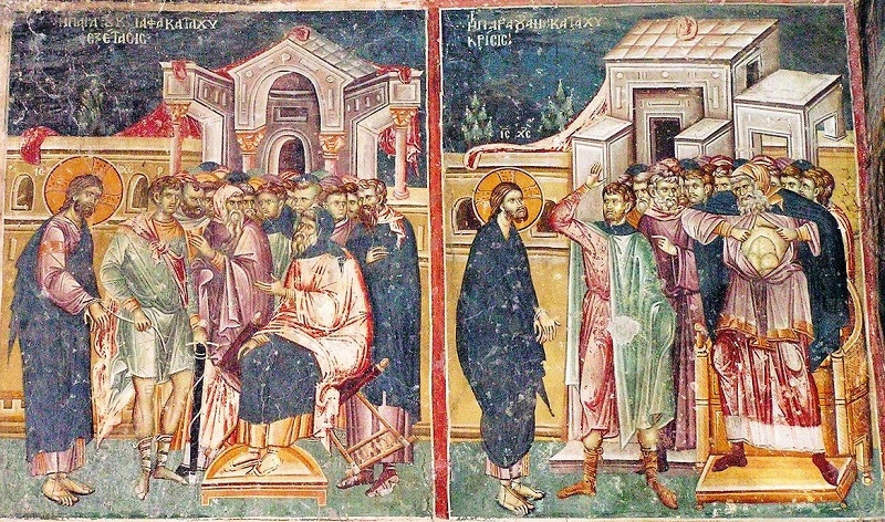 Каиафа как первосвященник, по закону возглавлявший синедрион, созвал заседание. Синедрион искал лжесвидетельства против Иисуса, чтобы предать Его смерти, но не находил. Наконец пришли два лжесвидетеля, которые рассказывали, что Иисус говорил: могу разрушить храм Божий и в три дня создать его. Так клеветники исказили слова Господа, когда Он некоторое время назад на Пасху говорил: разрушьте храм сей, и Я в три дня воздвигну его. При этом Господь, конечно, не говорил, что Сам разрушит храм, ведь так Он прикровенно говорил о Своей смерти и тридневном воскресении.