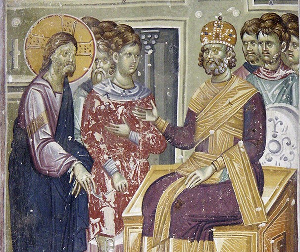 Осудив Господа на смерть, иудеи тут же повели Его к римскому наместнику Иудеи Понтию Пилату. Пилат, не любивший и презиравший иудеев, все же вышел к ним. Поскольку обвинения в кощунстве не могли интересовать Пилата, иудеи обвинили Господа в том, что Он развращает народ, запрещает давать подать кесарю и называет Себя Царем. Пилат, удалившись с Иисусом, стал допрашивать Его: Ты Царь Иудейский? Господь ответил ему: Царство Мое не от мира сего. Если бы от мира сего было Царство Мое, то служители Мои не допустили бы, чтобы Я был предан иудеям». Пилат сказал Ему: «Итак, Ты Царь?» Иисус отвечал: «Да, Я Царь. Я на то родился и для того пришел в мир, чтобы свидетельствовать об истине». Пилат понял, что Иисус не претендует на земное господство. Спросив: что есть истина? — он, не дожидаясь ответа, вышел к ожидавшим его иудеям. «Я никакой вины в Нем не нахожу», — объявил он им.