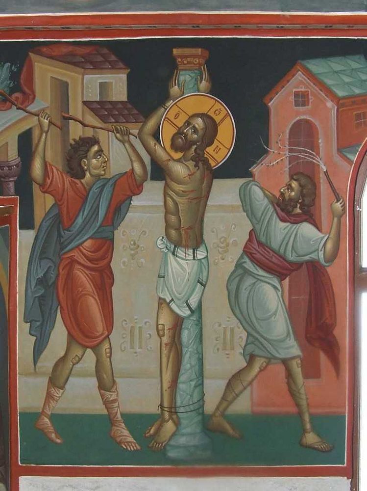 Пилат, отдав Иисуса воинам, велел Его бить. Долго продолжалось жестокое бичевание. После этого собрался весь полк, и воины, раздев Господа, одели Его в багряную одежду, будто бы изображающую царскую мантию, на голову Ему они возложили венец из колючего терна, а в правую руку Ему дали трость, как скипетр. Становясь пред Ним на колени, насмехались, говорили: радуйся, Царь Иудейский! А потом плевали на Него и, взяв трость, били Его по голове.