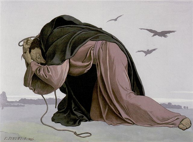 Когда Иуда, предавший Иисуса Христа, узнал, что синедрион осудил Господа на смерть, он раскаялся, возвратил тридцать сребреников первосвященникам и старейшинам, сказав: «Согрешил я, предав кровь невинную». Но они сказали ему: «А нам что до того?» В отчаянии, не веря в прощение и милосердие Божие, он, бросив деньги в храме, вышел вон и удавился.