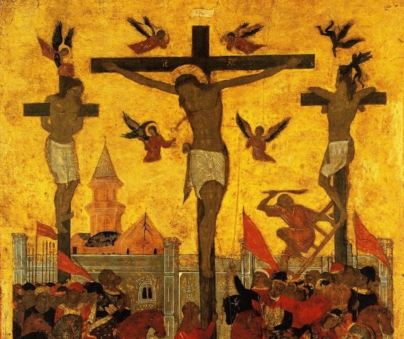 Голгофа была недалеко от города, и люди приходили посмотреть на казнь. Многие злословили: «Разрушающий храм и в три дня Созидающий! спаси Себя Самого; если Ты Сын Божий, сойди с креста». Смеялись над Христом и первосвященники с книжниками, старейшинами и фарисеями: «Других спасал, а Себя Самого не может спасти; если Он Царь Израилев, пусть теперь сойдет с креста, и уверуем в Него». Поносили Христа и распятые с Ним разбойники. У креста стояли Пресвятая Богородица и Ее родственница, Мария Клеопова, апостол Иоанн Зеведеев и Мария Магдалина. Скорбела Матерь Божия о распятом Сыне. Сбылось пророчество праведного Симеона: Тебе Самой душу пройдет оружие. Между тем Господь, увидев Свою Мать и ученика, которого Он любил, сказал, обращаясь к Богородице: Се, сын Твой. Потом — апостолу Иоанну: Се, Матерь твоя!