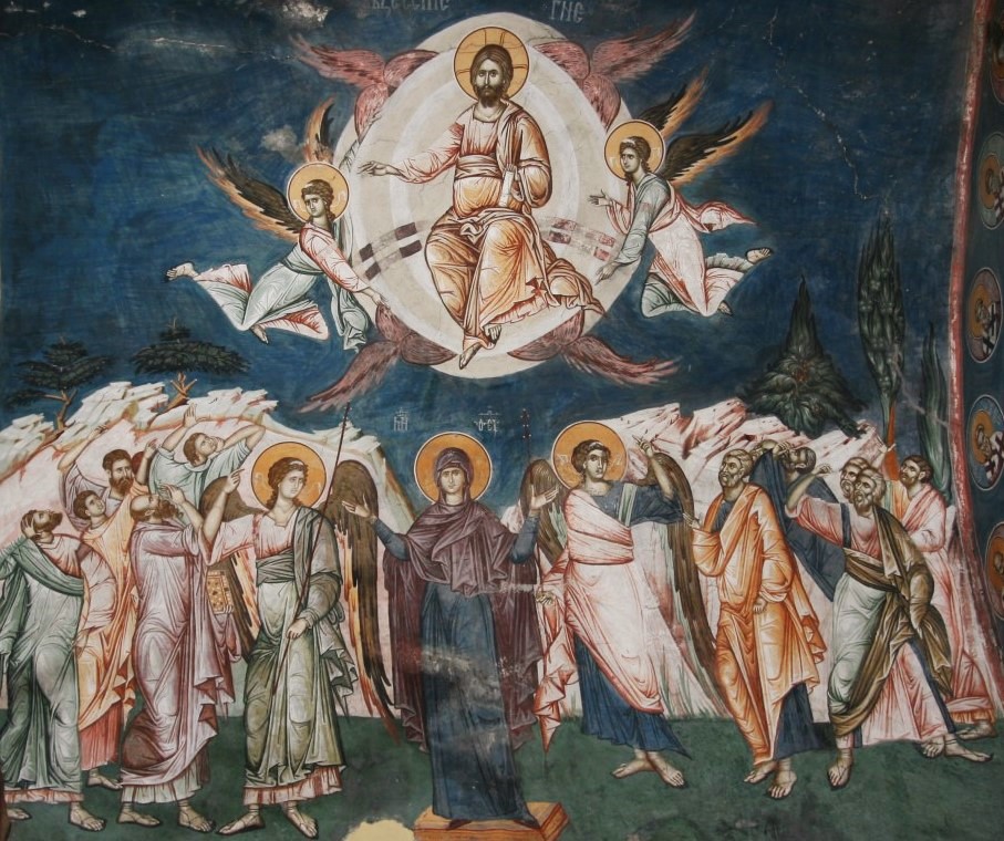 В продолжение сорока дней Иисус Христос являлся Своим ученикам, говоря с ними о Царствии Божием. Он повелел им не отлучаться из Иерусалима, но ждать обещанного от Бога дара Святого Духа. На сороковой день Господь вывел учеников из Иерусалима на Елеонскую гору. Ученики ждали, что Господь наконец воцарится, но Он сказал им: «Не ваше дело знать времена и сроки, которые Отец установил Своей властью. Вы примете силу, когда сойдет на вас Дух Святой, и будете Мне свидетелями в Иерусалиме и во всей Иудее и Самарии и даже до края земли». Говоря это, Он поднялся у них на глазах, и облако скрыло Его из вида. Когда они смотрели на небо во время восхождения Его, вдруг явились два Ангела, как два мужа в белых одеждах. Они сказали: «Что вы стоите и смотрите на небо? Сей Иисус, вознесшийся от вас, придет таким же образом, как вы видели Его восходящим на небо».