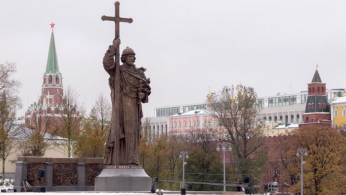Председник Путин је недавно отворио огроман споменик Светом Владимиру, који је крстио Русе, веома близу зидина Кремља. Ако станете на одређено место преко пута Кремља, видећете да крст, који Владимир држи, надвишује петокраку на Црвеном тргу, тако да је то снажна симболика.