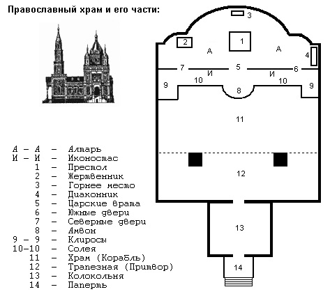 Обычно храм[1] состоит из притвора, средней части и алтаря.