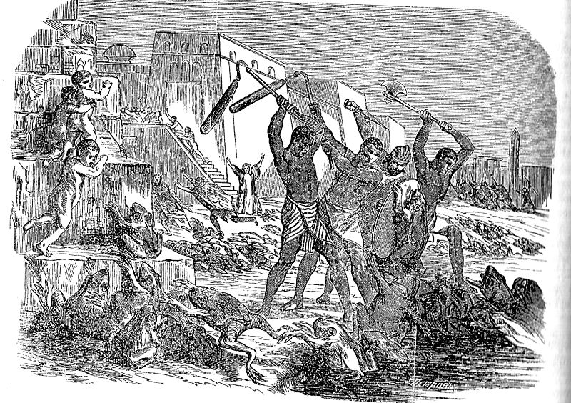 Когда Моисей по повелению Божию вернулся в Египет, он увидел толпу рабов – ропщущих, унывающих, трусливых, упрямых, не доверяющих ни его словам, ни чудесам, которые ясно показывали, что он посланник Божий. Что уж говорить о египтянах — они тем более не поверили ему. И чтобы все эти люди окончательно не погибли в своих заблуждениях, первые казни Господь насылает на всех, кто жил в Египте.