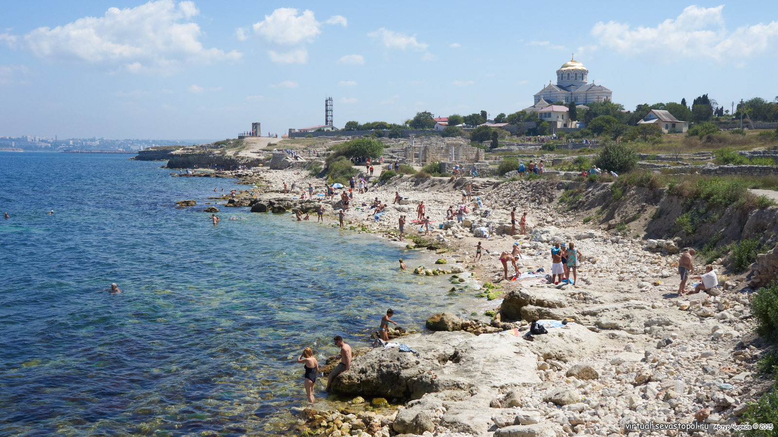 Городище Херсонеса находится на берегу моря. Севастопольцы, сколько себя помнят, купались здесь летом. Однако с прошлого года купаться в море запрещено. Заповедник! В непосредственной близости от руин, у кромки моря — прекрасный каменистый пляж. Некоторые рискуют и купаются, но мы не советуем: во-первых, патрули, во-вторых — камеры наружного наблюдения. Зачем вам скандал и объяснения с полицией! Купаться безбоязненно можно до 9 часов утра.