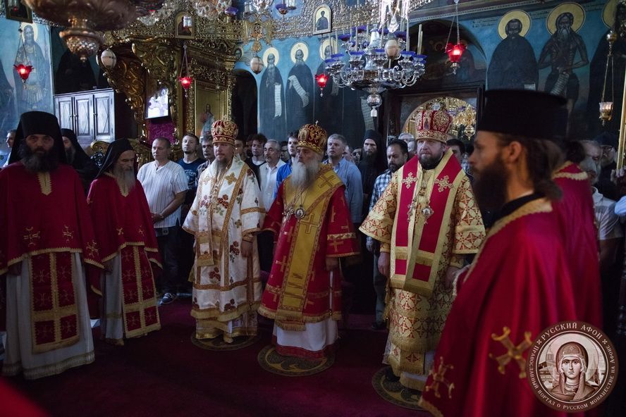 Делегация Русской Православной Церкви прибыла на Святую Гору 8 августа. Братия русской святогорской обители торжественно встретила прибывших архиереев у монастырских святых врат, после чего гости проследовали в соборный храм монастыря, где поклонились мощам великомученика и целителя Пантелеимона.