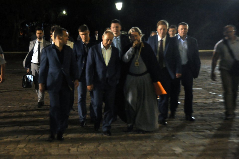 В сопровождении премьер-министра России Дмитрия Медведева и председателя Патриаршего совета по культуре, наместника Московского Сретенского мужского монастыря, викария Святейшего Патриарха Московского и всея Руси, епископа Егорьевского Тихона (Шевкунова), под звон колоколов президент вошел на соборную площадь. У входа в собор Владимира Путина встречал благочинный Севастопольского округа протоиерей Сергий Халюта.