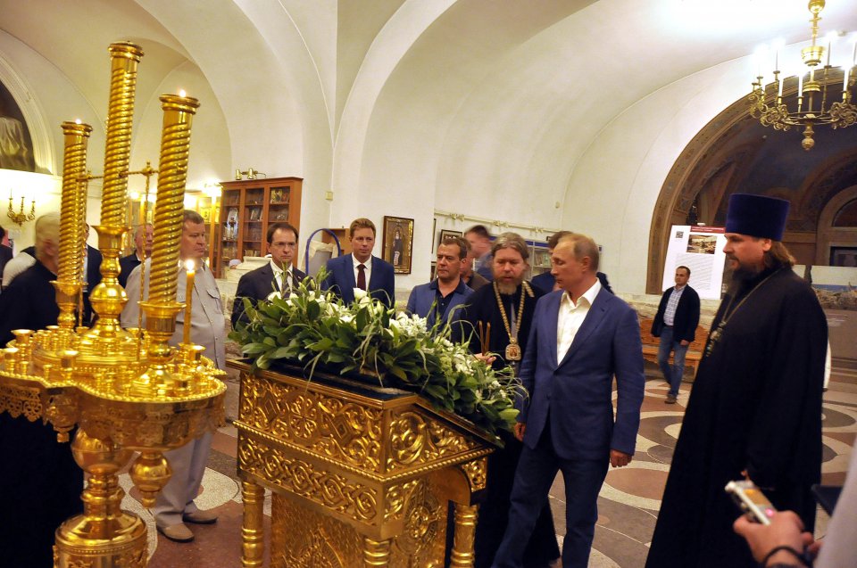 Делегация во главе с президентом России посетила нижний храм собора, где отец Сергий познакомил высоких гостей с его историей.