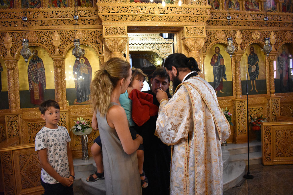 У недељу, 13. августа отишли смо на Свету Литургију у цркву посвећену Светој Ани у граду Катерини. На Литургији је саслуживао ђакон Бранислав Јоцић. Причестио се велики број деце и родитеља. Службу су улепшали и појци из нашег састава, сестре Милица Станковић и Милена Јанковић са своја два сина Василијем и Павлом. Након Литургије послужени смо доручком у парохијском дому где су нам пар песмица отпевале ученице веронауке при цркви Свете Ане.