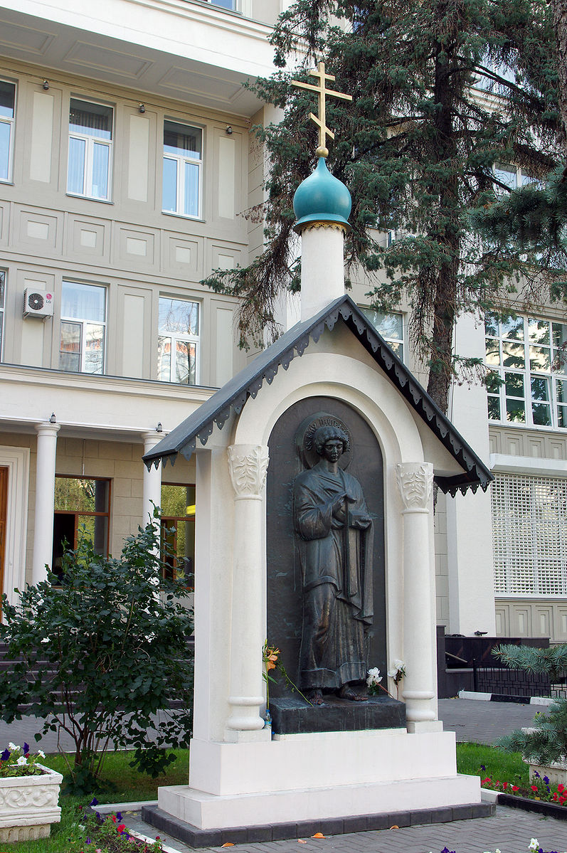 – Это работа скульптора Вячеслава Михайловича Клыкова. Он лечился у нас. Очень мужественно держался, как и вообще переносил все скорби, которых на пути настоящих христиан всегда предостаточно. Против талантливых, тем более верующих, людей ведется непрекращающаяся война. Этот памятник несколько раз переставляли с места на место. Поэтому наш нынешний директор, академик РАМН Валерий Иванович Чиссов, сам верующий человек, предложил: «Слава, давай поставим целителя Пантелеимона здесь!» Мы так благодарны Вячеславу Михайловичу за то, что он согласился. Над скульптурой соорудили небольшой купол с крестом. Относимся, как к часовне. Крестимся. Освящал этот образ владыка Алексий.