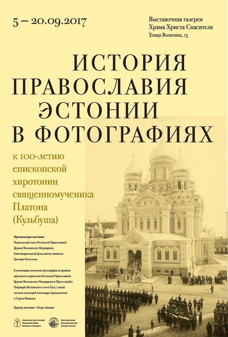 5 сентября 2017 года в 16:00 в Храме Христа Спасителя откроется выставка «История Православия Эстонии в фотографиях». Фотовыставка подготовлена Издательским отделом Эстонской Православной Церкви Московского Патриархата и Благотворительным фондом имени святителя Григория Богослова. В экспозицию включены фотографии из архивов церковного управления Эстонской Православной Церкви Московского Патриархата и Пресс-службы Патриарха Московского и всея Руси, а также частных коллекций Александра Дормидонтова и Сергея Мянника. Куратор выставки – Игорь Лапшин.