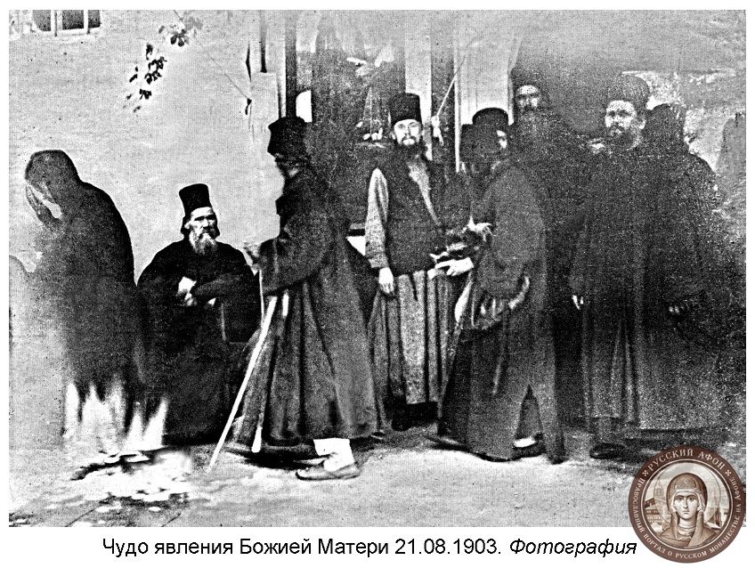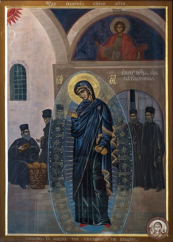 Как известно, 21 августа / 3 сентября 1903 г. в Русском на Афоне Свято-Пантелеимоновом монастыре свершилось чудесное явление Пресвятой Богородицы: во время раздачи милостыни при Святых Вратах Пантелеимоновой обители была сделана фотография, на которой впоследствии оказался запечатлен образ Божий Матери, принимающей милостыню из рук старца-инока в числе неимущих братий.