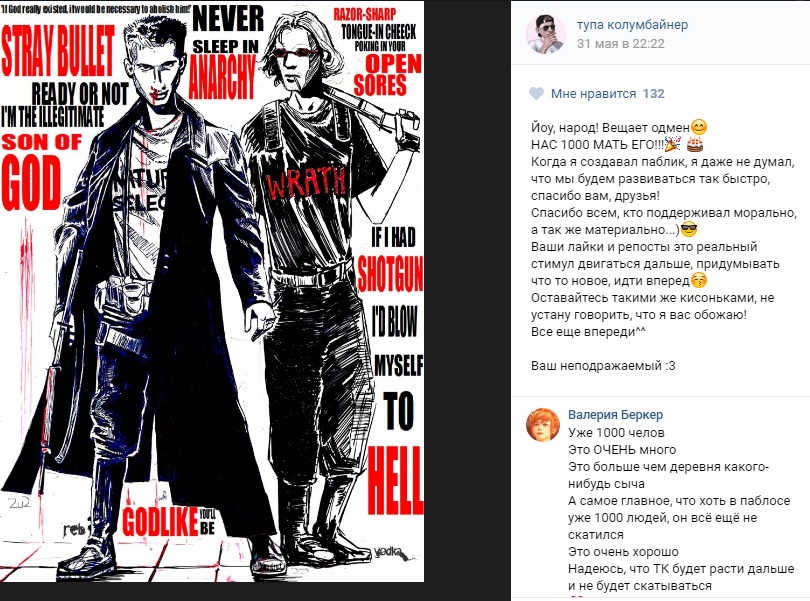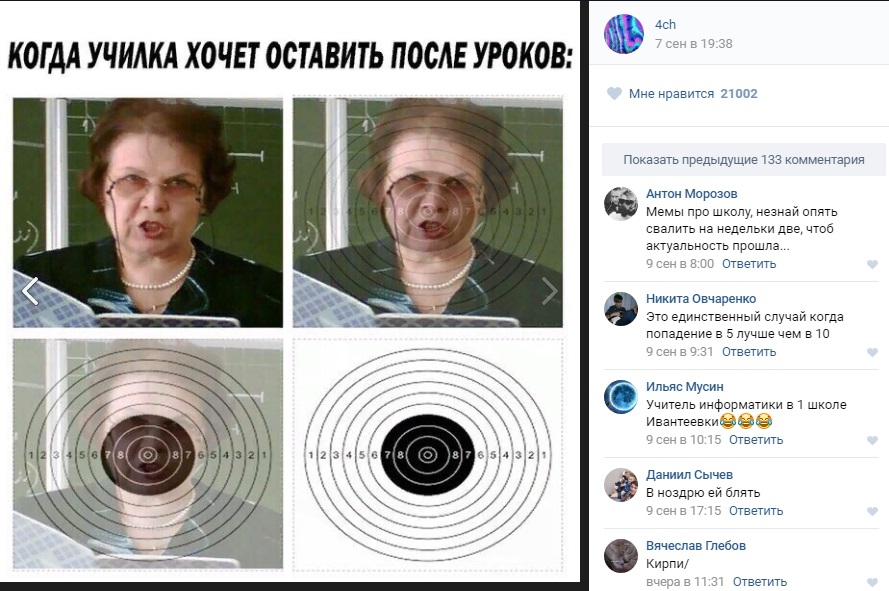 Примеры форсинга «ивантеевского колумбайна» (и привязки его к «группам смерти» и псковским суицидникам) в популярном (более 3,2 миллионов подписчиков) паблике 4ch, «прославившемся» омерзительными мемами о бесланской трагедии (и снова теракт в школе… случайное совпадение?..). Просим закрыть глаза на мат (да, именно так общаются в этих сообществах и в соцсети в целом) и обратить внимание на количество поставивших «лайки».