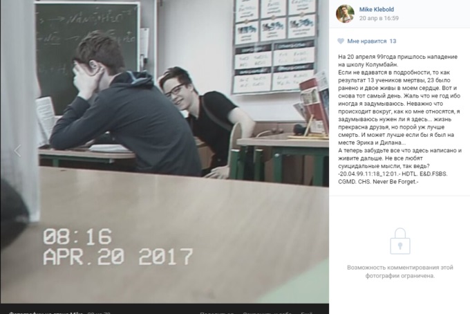 С горечью приходится констатировать, что наши прогнозы в очередной раз оправдались. Как мы и предполагали (эта тема подробно раскрыта в аналитическом докладе Кавказского геополитического клуба «Группы смерти» как угроза национальной безопасности России»), активный «форсинг» (продвижение) в социальной сети вКонтакте мемов, связанных с суицидальным терактом в американской школе «Колумбайн» (20 апреля 1999 г. двое старшеклассников расстреляли всех, кто попался под руку, а потом застрелились сами; кроме них, погибло 13 человек), был организован не из любви к «искусству», а в качестве одного из направлений отработки «базы» для совершения подростками религиозно и идеологически немотивированных терактов.