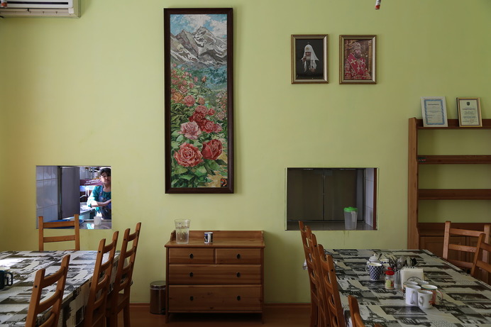 Сложно отказаться от такого приглашения. Юлия Владимировна отводит в трапезную, где нас ждут горячие щи, картофельная запеканка с подливкой и салат из свежих овощей.
