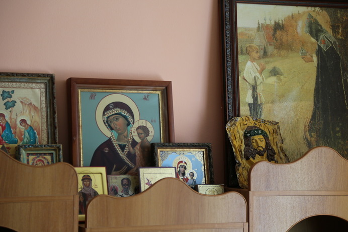 В большом уютном светлом помещении всё по-домашнему: рисунки, игрушки, цветы, «живой уголок» с крутящимся в колесе взъерошенным хомяком, многочисленные книги на полках и, конечно, иконы. Со всех стен и полок с любовью и строгостью взирают на нас святые лики.