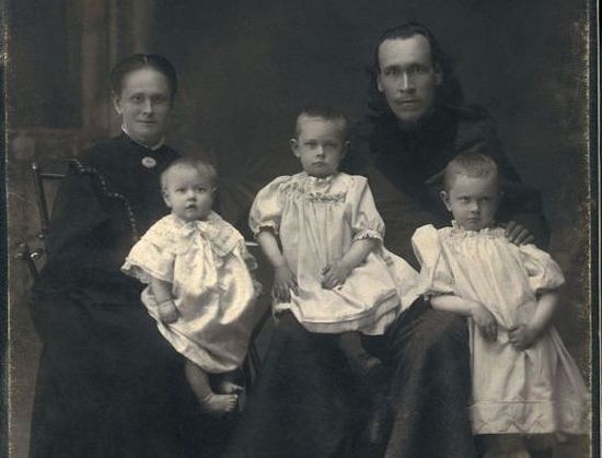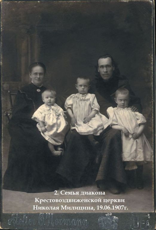 В семейном архиве сохранилась фотография от 19 июня 1907 года, в это время дед был диаконом Крестовоздвиженской церкви (фото 2). На ней запечатлены о. Николай, Юлия Данииловна и трое детей, родившихся к тому времени, – Ангелина, Елена и Василий.