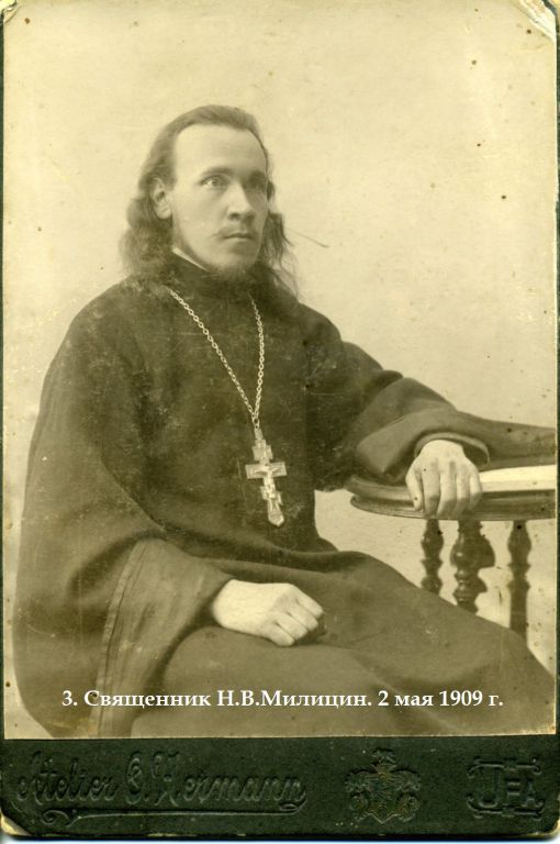 Когда в марте 1909 года диакон Крестовоздвиженской церкви Николай Милицин был рукоположен во священника, ему было уже 32 года. О.Николай стал священником не юнцом, только что окончившим семинарию, но мужем, который долго и упорно шел к своей цели. Сложность его пути состояла в том, что его отец вышел из духовного звания. Выход из духовного звания осуществлялся по особому разрешению высшего епархиального руководства и оформлялся резолюцией Его Преосвященства. Сам Николай, похоже, получил не духовное, а светское образование, что задержало его рукоположение (тех, кто оканчивал семинарию, сразу рукополагали во священников). Поэтому после выхода из монастыря Николай Милицин 6 лет был псаломщиком и 9 лет диаконом, прежде чем был рукоположен во священника. Его путь потребовал терпения, смирения и настойчивости.