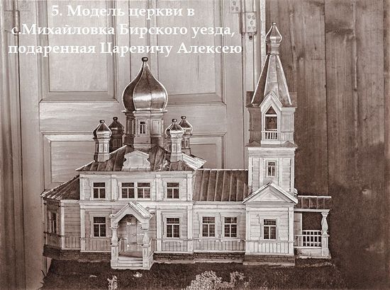«В феврале 1913 года священник села Иглино Уфимской губернии Николай Милицин удостоился лично преподнести Государю Наследнику Алексию Николаевичу изящную модель строящейся в селе Михайловке Бирского уезда деревянной церкви. За таковое подношение о.Николай Милицин удостоился получить благодарность от Имени Августейшего Наследника Цесаревича, а Государыней Императрицей Всемилостивейшее пожалован золотыми с цепочкой часами, с изображением Государственного герба, из кабинета Его Величества. Дорогой Царский подарок был препровожден счастливому о.Милицину при соответствующем отношении заведывающего канцелярией Ее Величества графа Ростовцева (от 11 марта за № 2529). На новостроящуюся церковь, модель которой была преподнесена о.Милициным Государю Наследнику, Всемилостивейшее выдано от Монарших щедрот 300 рублей».