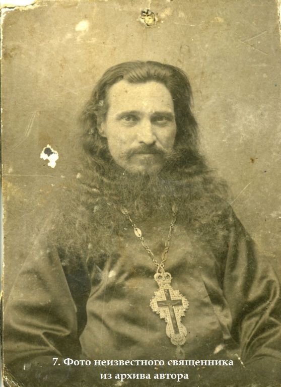 Среди сохранившихся фотографий была фотография неизвестного священника, которую дети хранили так же трепетно, как и фотографии наших родных. Фотография старая, истертая, выцветшая, с дыркой от гвоздя – видно, что долгое время она была прибита к стене.