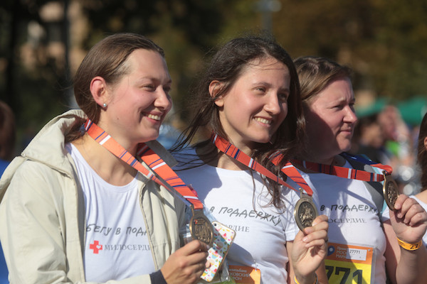 Служба помощи «Милосердие» проводит акцию второй год подряд. На этот раз акцию поддержали 190 благобегунов – это в 5 раз больше, чем в прошлом году. Также в поддержку службы «Милосердие» бежали команды сотрудников компаний «Clarins», «Ehrmann», «Sweet Dreams», «VNV Production», «Небесная хижина» и участники волонтерского проекта «Комбинат добра» компании «Норникель».