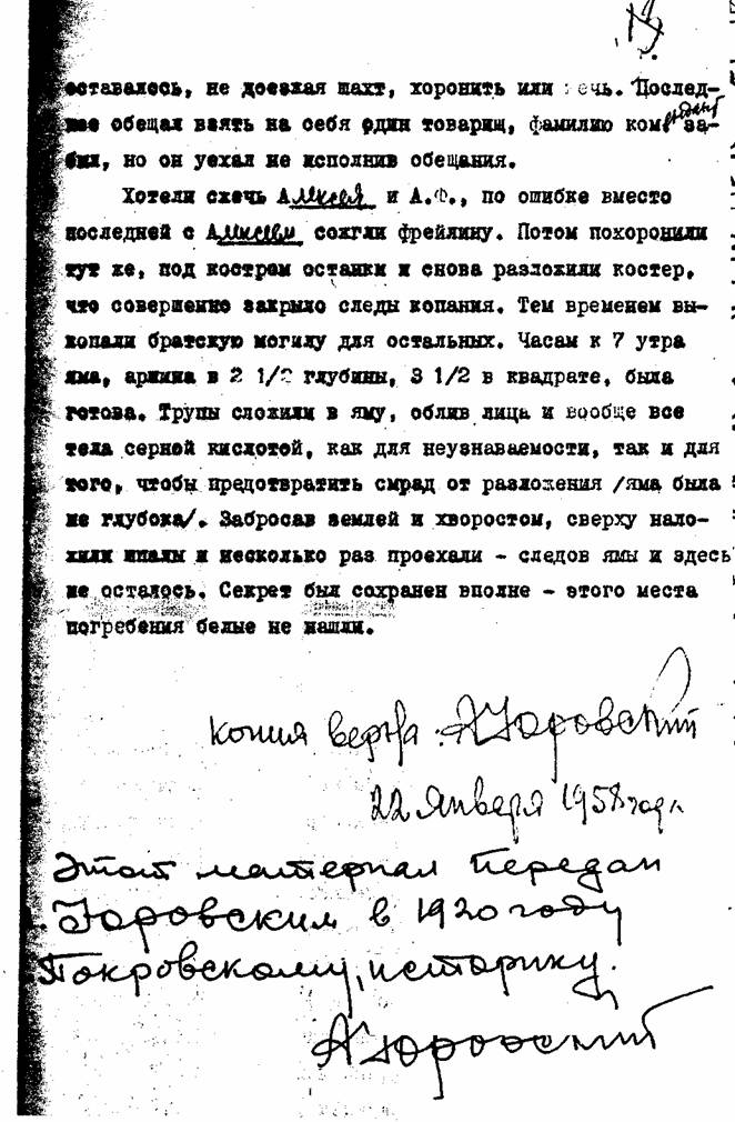 «5. Необходимо получить подробное заключение касательно “Записки Юровского” — сколько существует версий этой записки, происхождение двух последних абзацев записки, написанных академиком Покровским. Провести почерковедческую экспертизу.