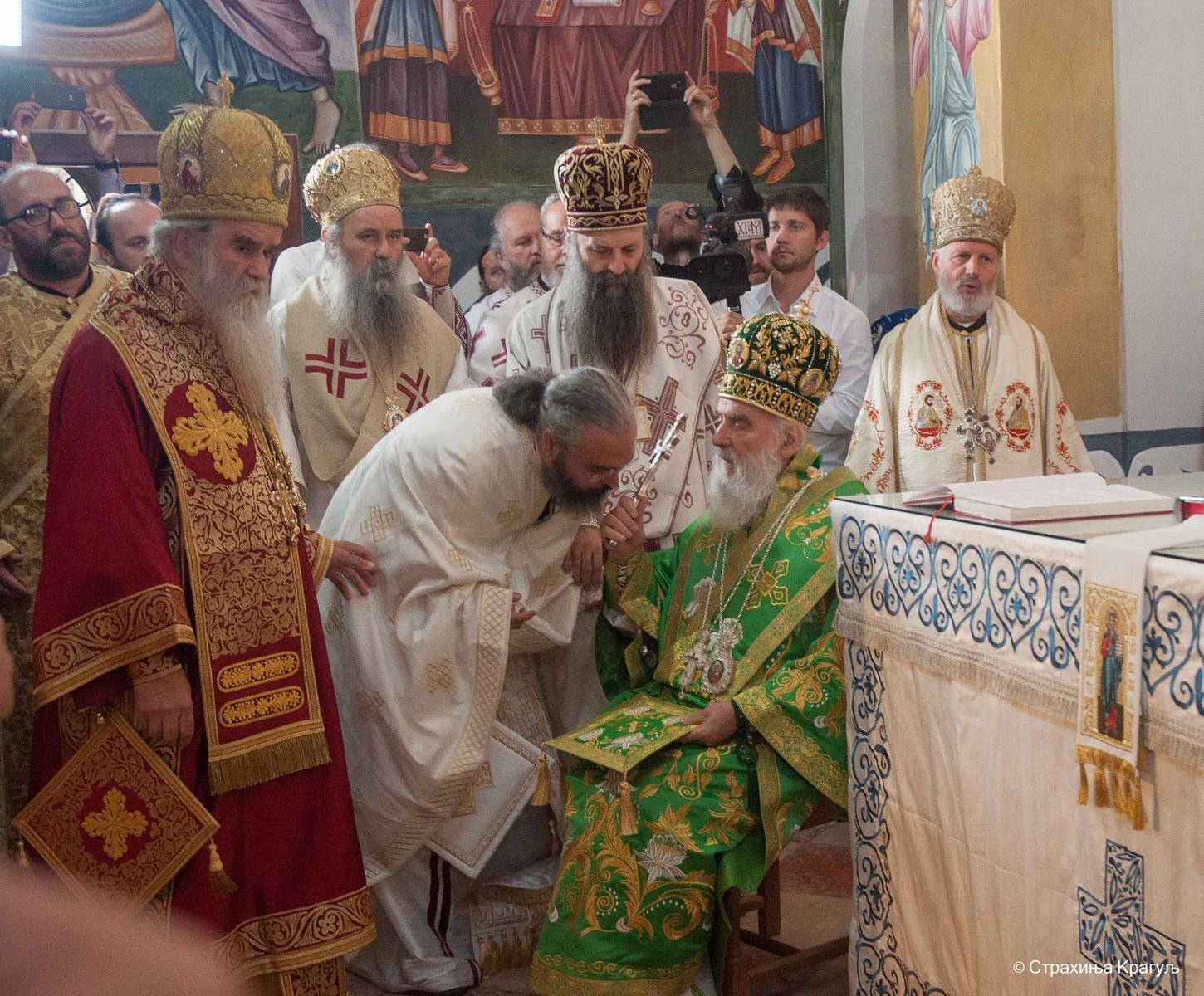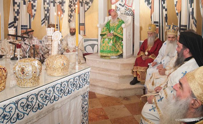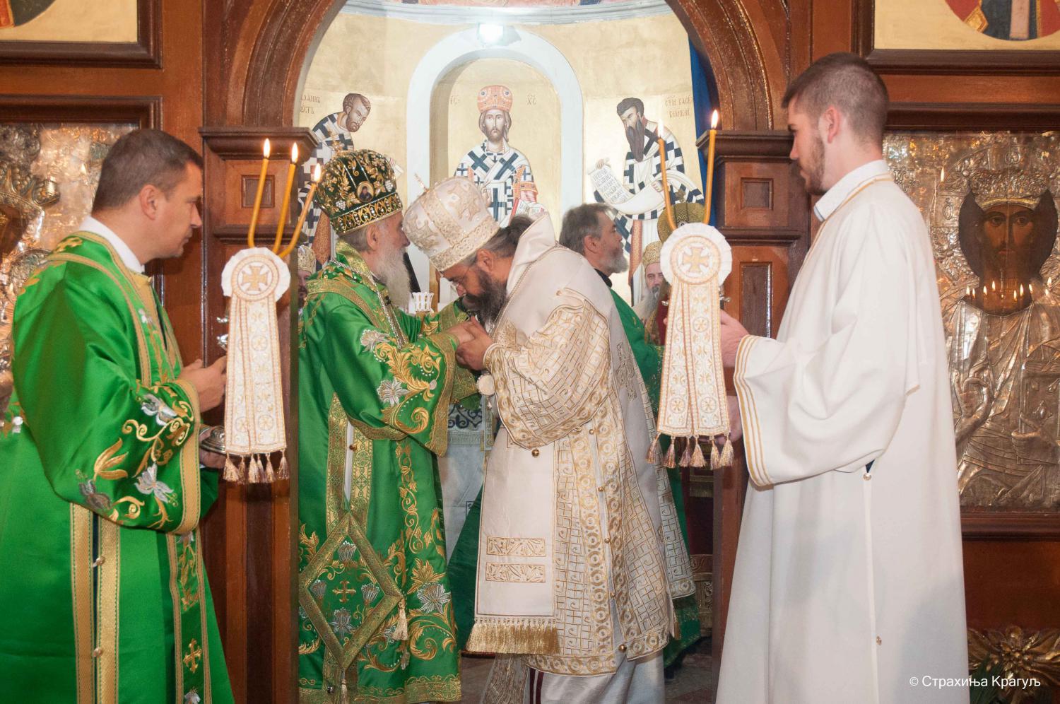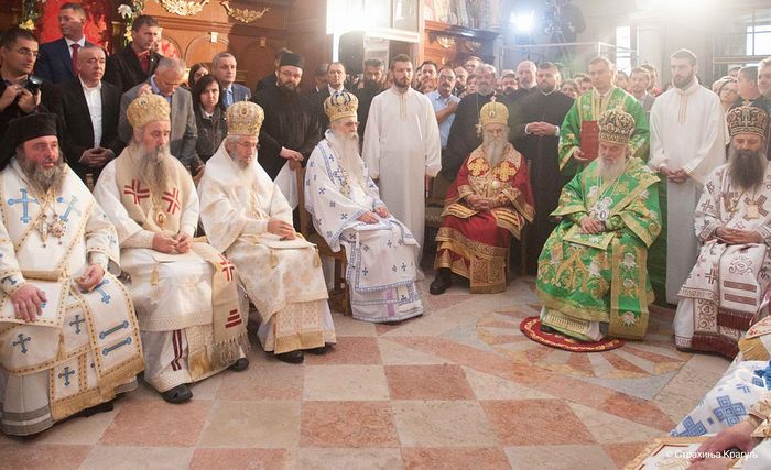 Свету архијерејску Литургију, потом, служио је Његова Светост Патријарх српски г. Иринеј уз саслужење високопреосвећене господе митрополитâ: црногорско-приморског Амфилохија и загребачко-љубљанског Порфирија и преосвећене господе епископа: бачког Иринеја, врањског Пахомија, шумадијског Јована, браничевског Игантија, зворничко-тузланског Фотија, милешевског Атанасија, горњокарловачког Герасима, крушевачког Давида, славонског Јована, бихаћко-петровачког Сергија, брегалничког Марка и стобијског Давида, као и бројним свештеницима и ђаконима.