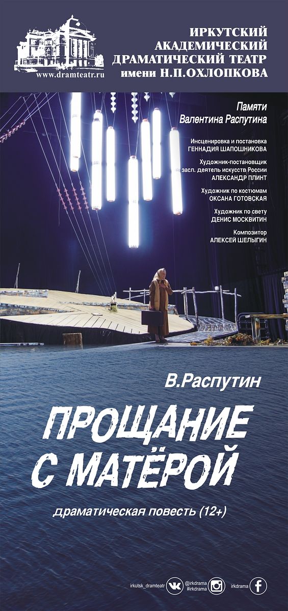 В Москве 16 октября 2017 года на основной сцене Государственного академического Малого театра пройдет новый спектакль «Прощание с Матёрой» по одноименной популярной повести Валентина Распутина. Ее в лучших классических традициях представит один из самых интересных театров страны – Иркутский драмтеатр им. Охлопкова. Премьера спектакля состоялась 10 марта в Иркутске. Она была приурочена к празднованию 80-летия Распутина, который жил и работал в этом городе, а 15 марта он был показан землякам писателя из Усть-Удинского района.