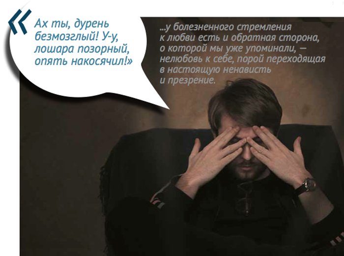 Все это формирует у человека тотальную неуверенность в том, что он вообще достоин любви. И со временем он создает в воображении некий идеальный образ самого себя — прекрасного, сильного, умного, решительного. И, безусловно, заслуживающего любви и признания. А вот себя, реального, он совсем не любит, даже презирает, и всё время сравнивает с портретом, который нарисовала ему собственная фантазия. Понятно, что рядом с этим фантомом он всегда обречен на сокрушительный проигрыш. И потому столь важной становится для него реакция окружающих, потому так стремится он увидеть или почувствовать, что для них он тоже — хороший, красивый, сильный, ничуть не хуже того, придуманного. И в таком вот растрепанном состоянии у человека проходит порой вся жизнь…