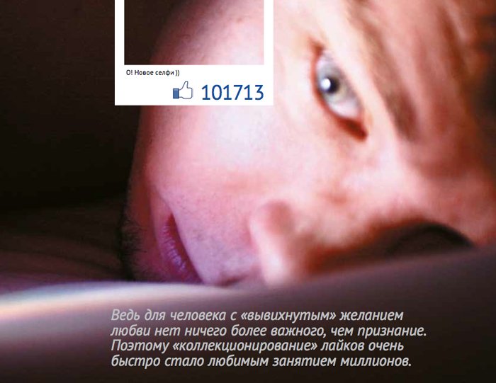 Хотя с появлением фотокамер на передней панели смартфонов, более чем серьезную конкуренцию котикам составили «селфи» — разновидность автопортрета, сделанная с расстояния вытянутой руки. Правда, здесь оказался задействован уже несколько иной принцип — та самая потребность постоянно смотреть на себя чужими глазами в надежде на одобрение. И теперь ожидание вожделенных красных флажков на синем фоне заставляет людей едва ли не ежеминутно заглядывать на свои странички в Интернете: не лайкнул ли меня еще кто-нибудь?