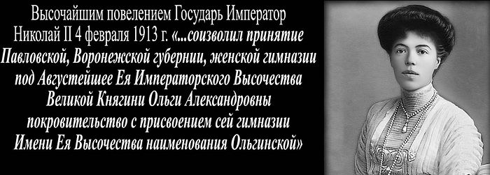 «Государь Император, по всеподданнейшему докладу Министра Народнаго Просвещения, в 4 день февраля 1913 года, Высочайше соизволил на принятие Павловской, Воронежской губернии, женской гимназии под Августейшее Ея Императорского Высочества Великой Княгини Ольги Александровны покровительство, с присвоением сей гимназии по Имени Ея Высочества наименования Ольгинской», – говорится в документе, хранящемся в «Полном собрании законов Российской империи».