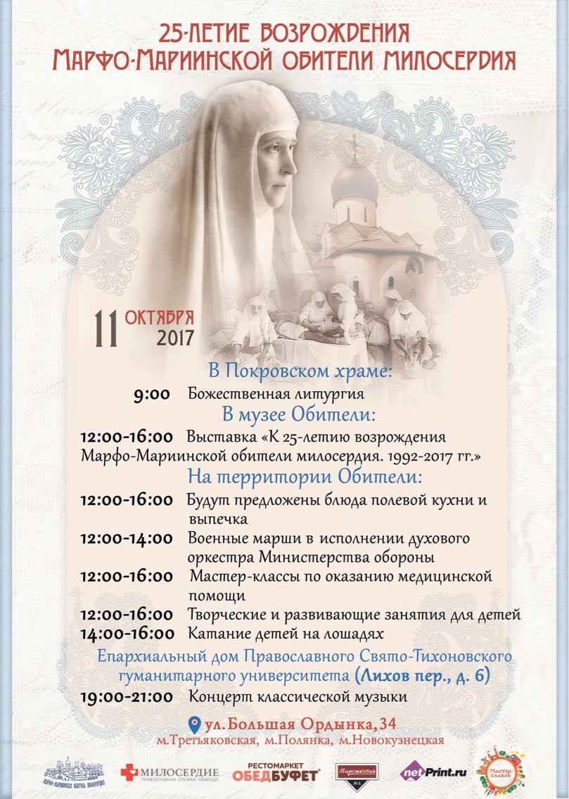 После полудня будут организованы бесплатные экскурсии в музей великой княгини на выставку «К 25-летию возрождения Марфо-Мариинской обители милосердия. 1992 - 2017 гг.».