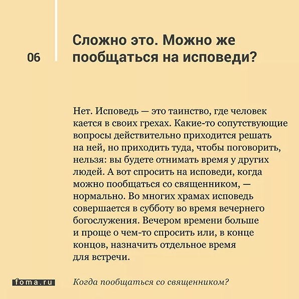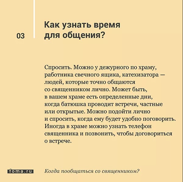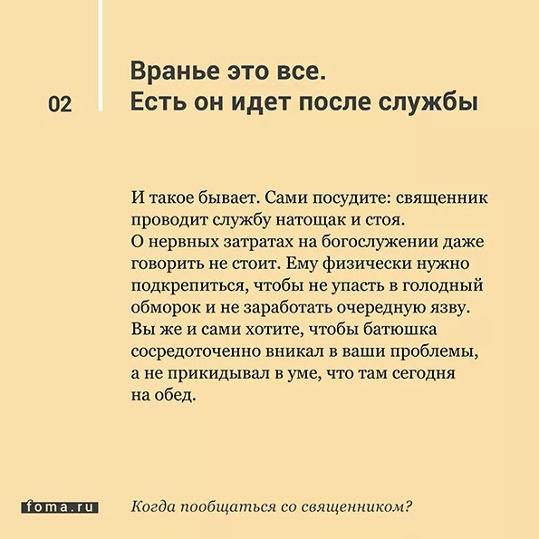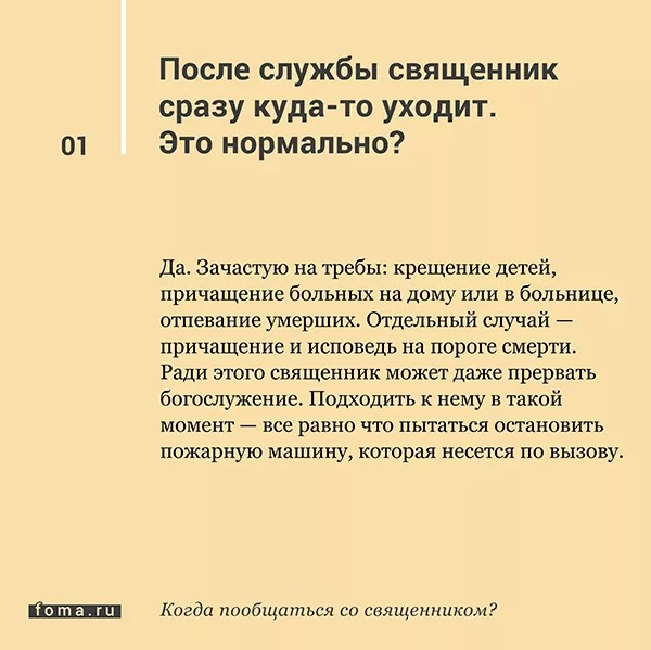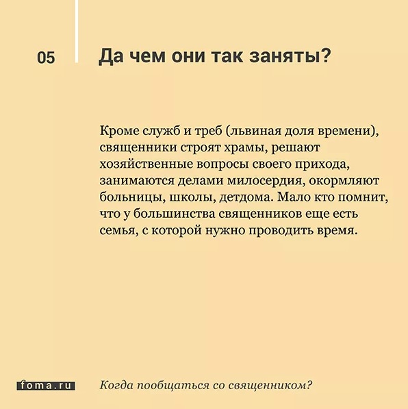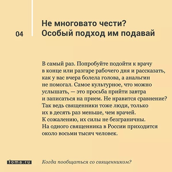 В наших Вопросах священнику мы часто пишем, что многие вопросы веры нужно решать лично со священником. А когда их решать? Тема для многих больная. Батюшка постоянно занят (чем?), вечно спешит (куда?), и такое впечатление, что ему не до людей (нет). Попробуем понять, как «поймать» священника и спокойно пообщаться. Рассказываем в «Слайдах» .