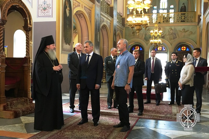 В Троицком соборе Миссии Министра обороны приветствовал Начальник Русской Духовной Миссии архимандрит Александр (Елисов) в сопровождении секретаря РДМ игумена Никона (Головко).