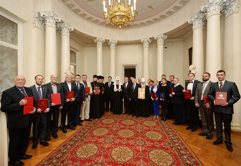 Затем Святейший Патриарх Кирилл наградил Патриаршими грамотами членов Экспертного совета по премиям памяти митрополита Московского и Коломенского Макария (Булгакова). Во внимание к вкладу в утверждение традиционных ценностей в обществе Патриарших грамот были удостоены: председатель Экспертного совета Фонда по премиям памяти митрополита Макария (Булгакова) С.П. Карпов и клирик храма святителя Николая Мирликийского в Кузнецах г. Москвы иерей Андрей Постернак.
