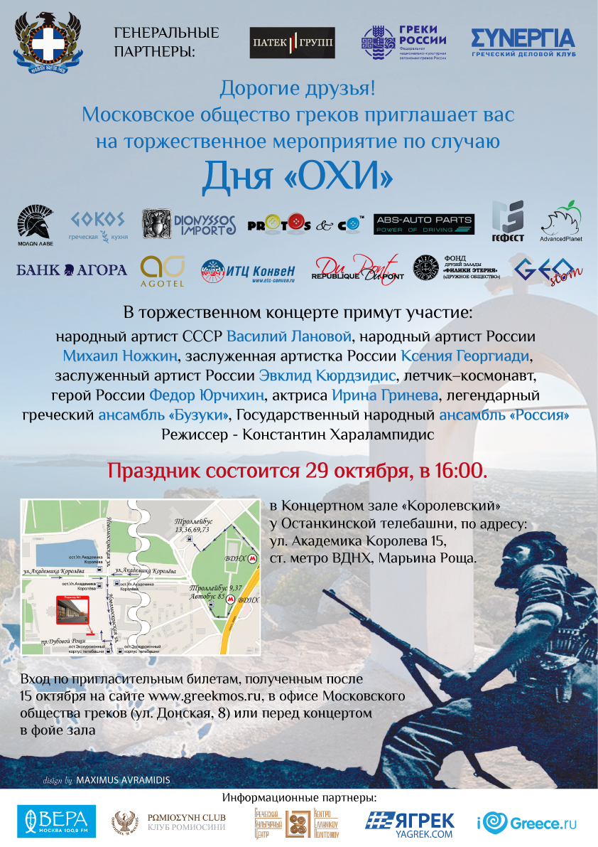 29 октября 2017 года Московское общество греков организует большой праздничный концерт, посвященный национальному празднику Греции – Дню «Охи».