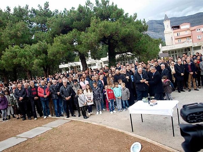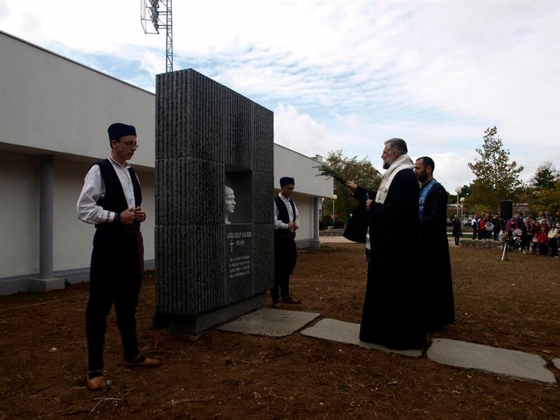 Споменик у насељу Брегови испред стадиона малих спортова, који носи име овог хероја, освештао је Његово преосвештенство владика захумско-херцеговачки и приморски Григорије уз саслужење свештенства епархије.