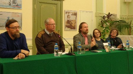 A panel discusses the publication of the Russian translation of The Superstition of Divorce. Adam Strock is seated second from the left. Photo: blagovest-info.ru