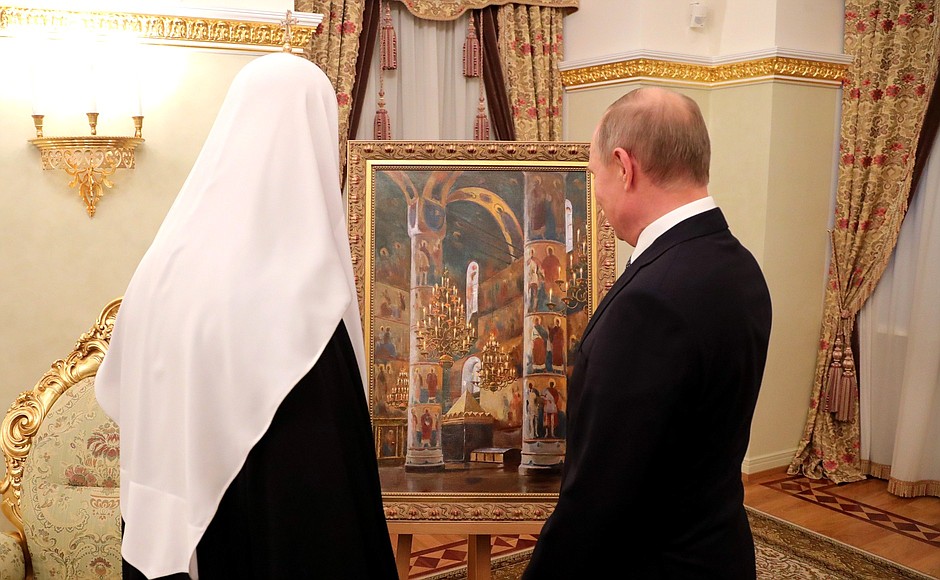 Президент подарил Патриарху картину «Успенский собор Кремля», художник – Владимир Лаповок. Патриарх Кирилл поблагодарил Владимира Путина за поддержку сотрудничества государства и церкви, сообщает сайт «Президент России».