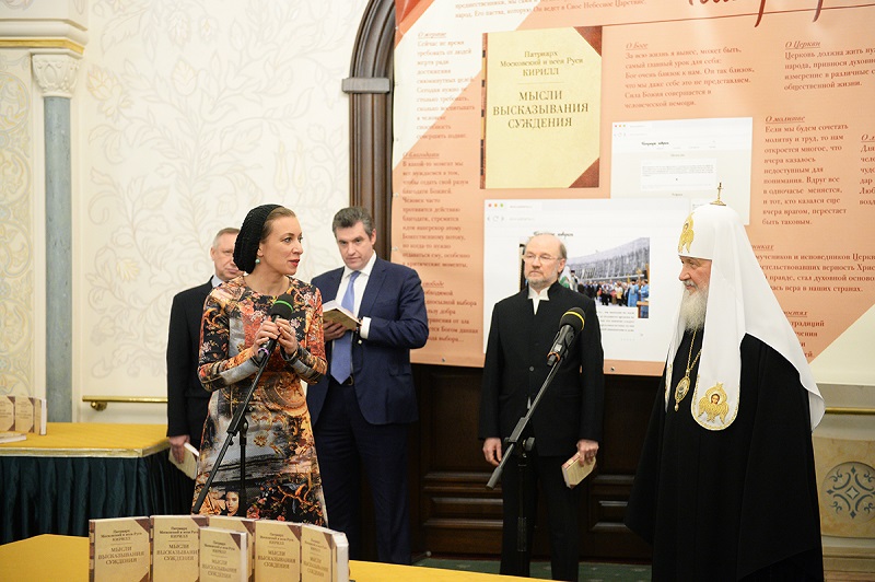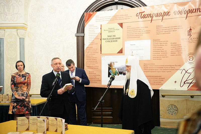 В своем выступлении составитель книги, первый заместитель председателя Синодального отдела по взаимоотношениям Церкви с обществом и СМИ А.В. Щипков отметил: «Сегодня мы представляем одновременно два больших проекта: книгу Святейшего Патриарха Московского и всея Руси, которая называется "Мысли. Высказывания. Суждения", и новый интернет-сайт, который называется "Патриарх говорит"».