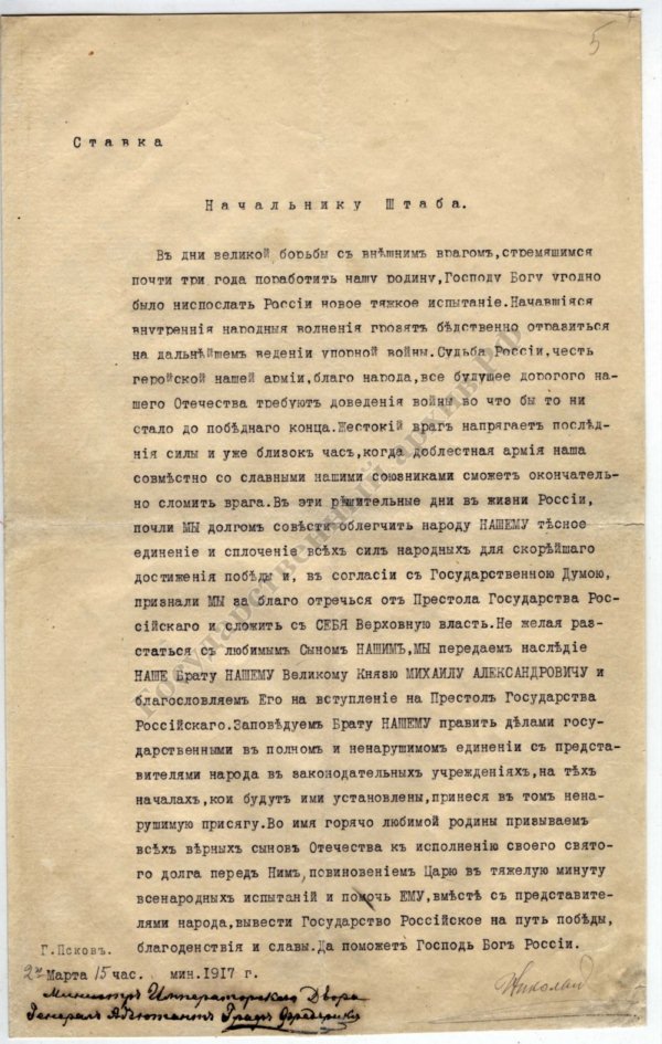 ... Нужно мое отречение. Рузский передал этот разговор в ставку, а Алексеев всем главнокомандующим. К 2 1/2 ч. пришли ответы от всех. Суть та, что во имя спасения России и удержания армии на фронте в спокойствии, нужно решиться на этот шаг. Я согласился. Из ставки прислали проект манифеста. Вечером из Петрограда прибыли Гучков и Шульгин, с которыми я переговорил и передал им подписанный и переделанный манифест. В час ночи уехал из Пскова с тяжелым чувством пережитого.
