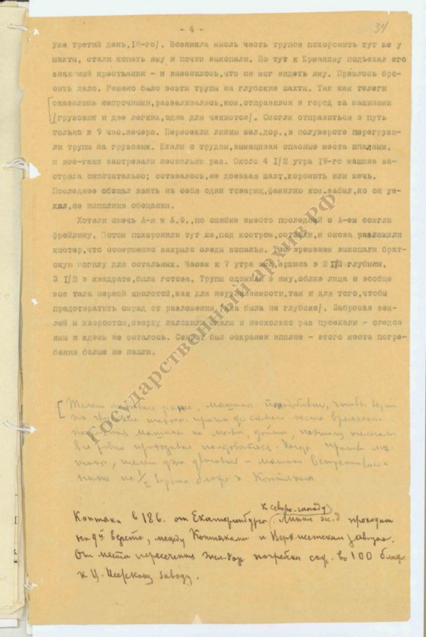 «О месте погребения убитых было сказано, что сначала их похоронили в двух местах за вторым Екатеринбургом, а затем увезли дальше и похоронили в разных местах. Где именно — это сказано не было. Я, по крайней мере, не слышал».