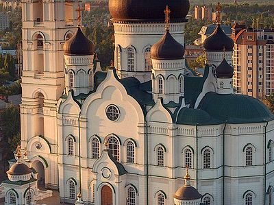 The church takes its name from the eponymous Ukrainian Baroque cathedral that was built in 1718-35 in place of an earlier church commissioned by St. Mitrofan of Voronezh; it was destroyed by the Soviets in the 1950s. The existing bell tower echoes the one designed for the old cathedral built by Giacomo Quarenghi.