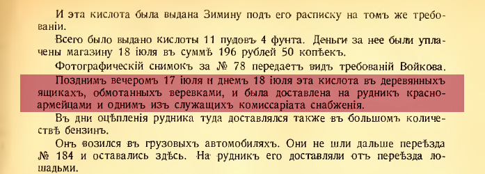 Пётр Валентинович, почитайте внимательно следственные материалы Н. Соколова. Очень убедительно в его материалах сказано, что утром 17 июля кислоту и бензин на рудник не привозили. Н. Соколов пишет: «Поздним вечером 17 июля и днем 18 июля эта кислота в деревянных ящиках, обмотанных веревками, и была доставлена на рудник красноармейцами и одним из служащих комиссариата снабжения».